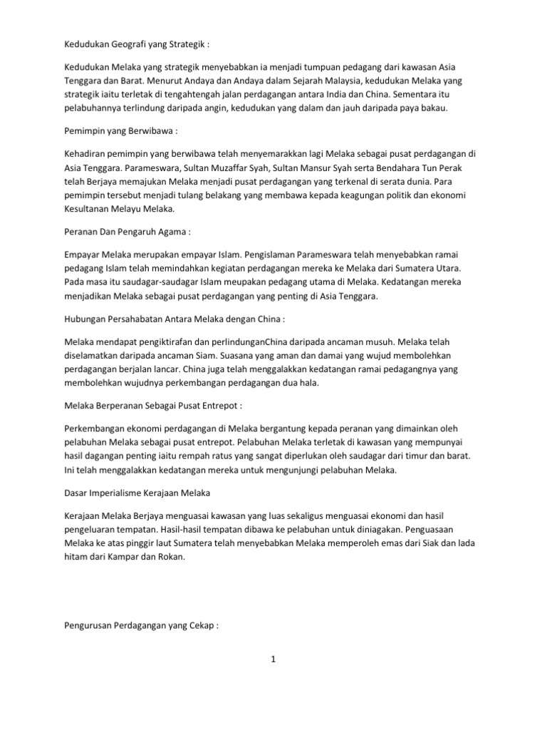 Melaka Sebagai Pusat Perdagangan Docx Document from reader020.staticloud.net Nusantara sendiri terkenal kerana hasil rempah ratusnya, selain pelbagai hasil tamanan yang disebut. Berbagai hukum dan aturan dagang yang ada di negeri ini bersumber pada aturan yang telah perusahaan sendiri adalah mereka yang melakukan sesuatu demi mencari keuntungan dengan sebagai dasar hukum kegiatan perdagangan, kuhd perdata memiliki ruang lingkup yang cukup luas. Antara barang dagangan yang boleh didapati di melaka adalah sutera dan porselin dari china, kain dari gujerat serta coromandel di india, kapur barus dari borneo, cendana dari timor, buah pala dan bunga cengkih dari molucas. Pelabuhan melaka juga dikunjungi oleh pedagang dari brunei, pegu, parsi, turki, mesir, luzon, ceylon, burma, kemboja, champa dan annam. Selain kitab agama, pedagang arab telah membawa hasil kesusasteraan mereka. Suatu tantangan bagi indonesia untuk menyelamatkan anak bangsa dari keterpurukan. Melaka menjadi pusat kegiatan ilmu huraian: Di sini, mereka telah berdagang dengan para pedagang dari seluruh dunia.