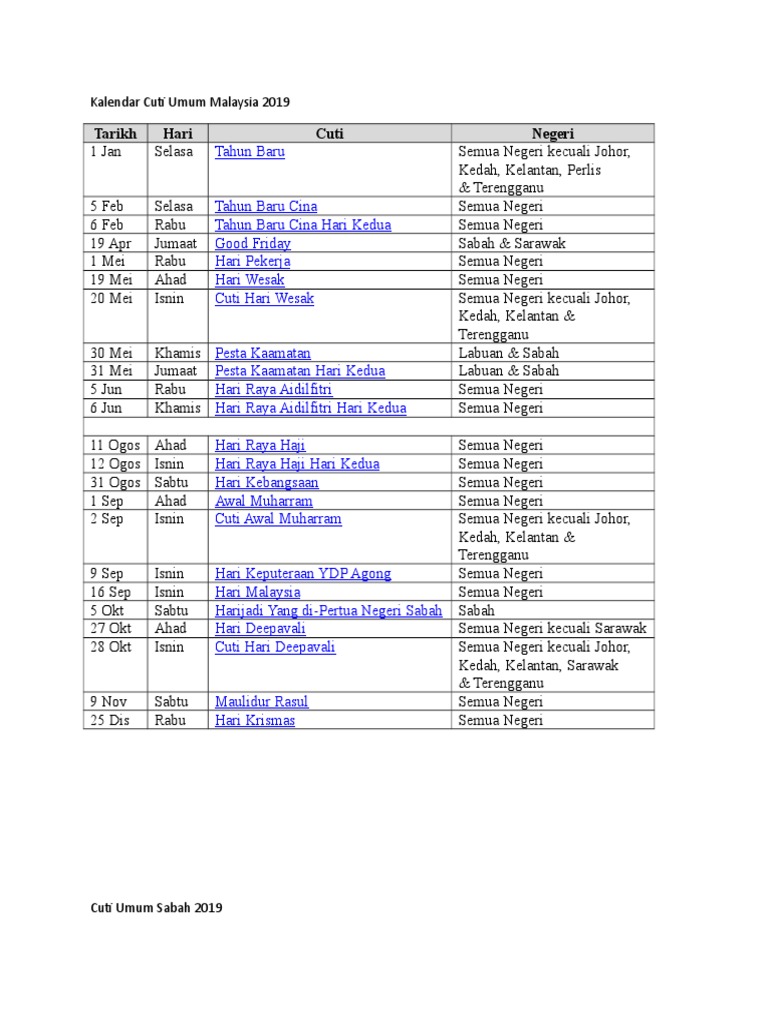 Last updated ( monday, 14 october 2019 ). Laman ini mengandungi kalendar cuti umum untuk tahun 2019 di perlis. Sila semak laman web ini untuk maklumat terkini. Semoga kalender/takwim cuti umum 2019 (hari kelepasan am) dan cuti sekolah 2019 ini dapat membantu anda dalam membuat perancangan awal percutian keluarga seperti memilih destinasi, membeli tiket penerbangan, menempah hotel dan sebagainya. 6 long weekends yang anda.